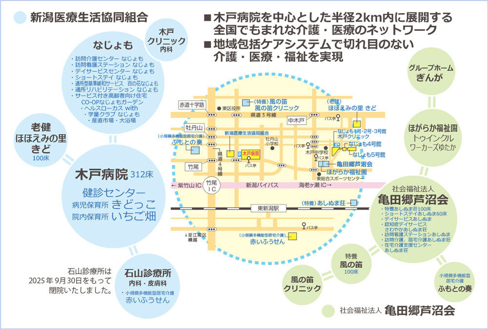 新潟医療生協は、治療から予防・リハビリを含めた総合医療、病気とともに暮らし、生活を支える医療・福祉の充実、在宅機能の強化と連携、地域との連携をはかっています。